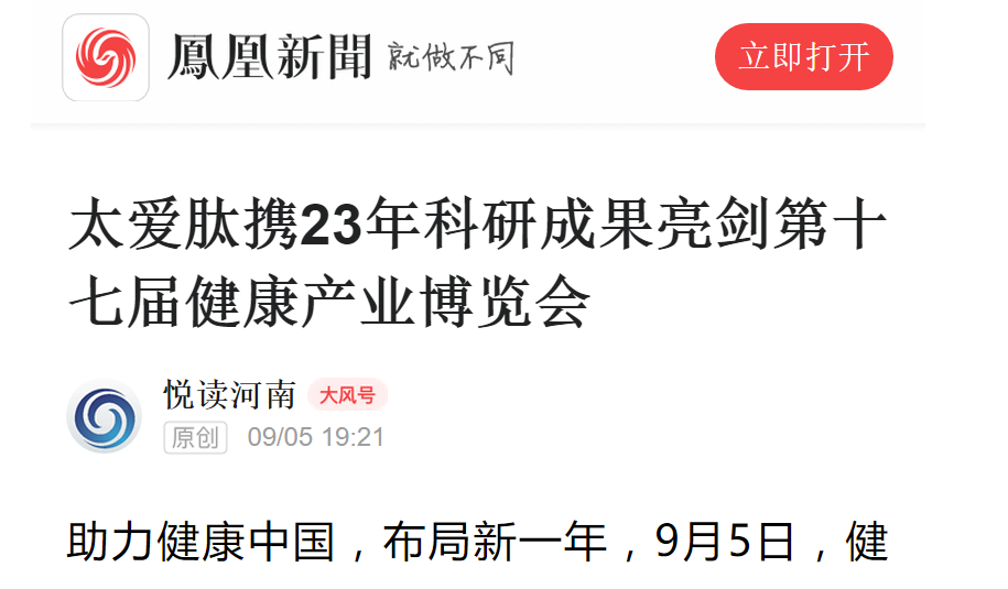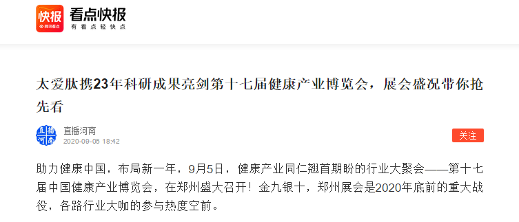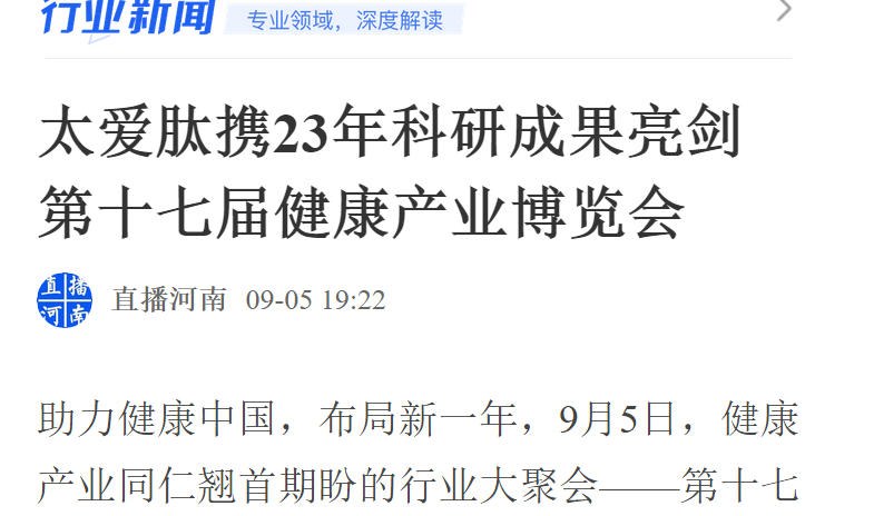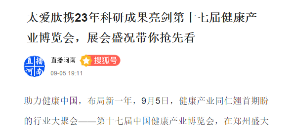 9月6日下午,在郑州举办的第十七届中国健康产业博览会落下帷幕。作为此次展会最大参展商之一,腾讯、网易等各路主流媒体,对太爱肽进行了多方位的跟踪报道。