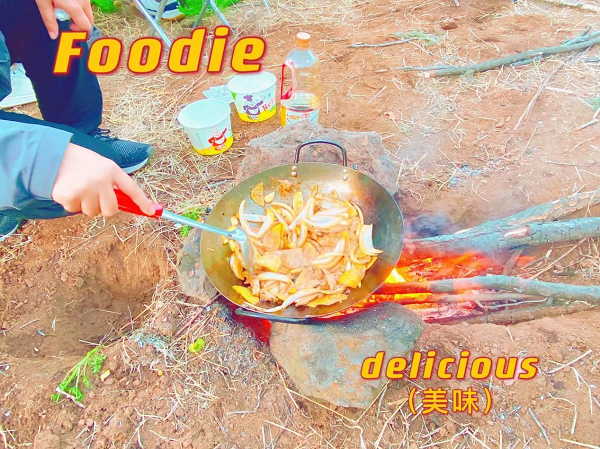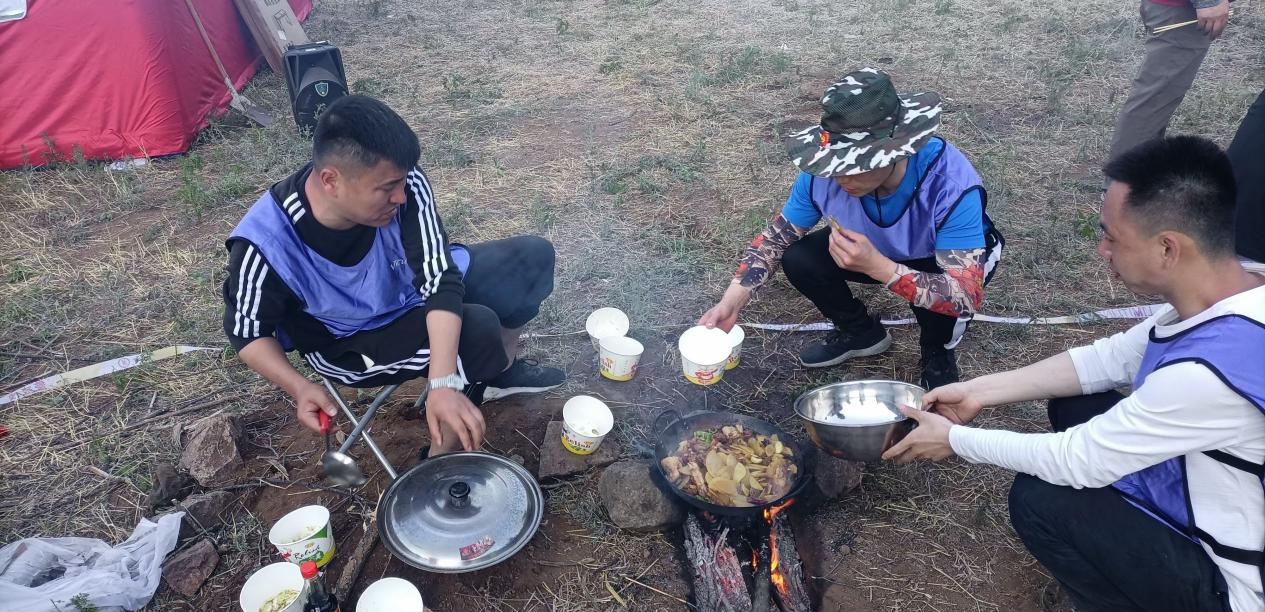 抵达营地后,每个队开始生火做饭,各组员分工明确,有负责钻木取火的、有捡柴的,心细贤惠的女生,负责洗菜、切肉等工作。起火、烤炒美食、打下手、递佐料……大家齐心协力、相互配合。