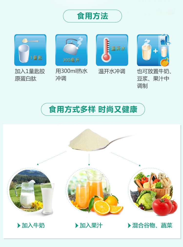 | 温馨提示 | 1、产品可以加入牛奶、果汁、汤羹、冰激凌等食品中食用;2、食用时水温或食物温度不宜过高,以免破坏营养成分;3、为保持最佳风味,请取用后将罐口密封好,以免受潮;4、产品形状为细粉,请勿干吃,以免呛嗓;5、产品冲调置于常温超过12小时后,请勿再饮用(视环境因素);6、对产品过敏者,不可继续食用,请及时就医。 | |